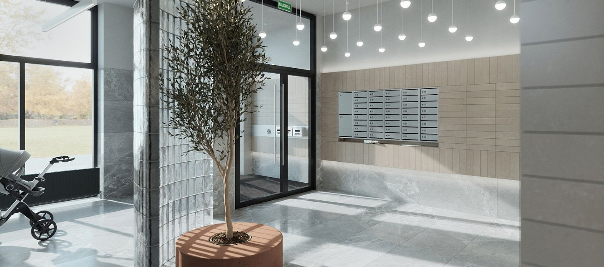 Удобные колясочные, зоны для чистки лап собак, почтовые ящики, которые также являются элементами дизайна, зоны ожидания делают лобби удобными и практичными.