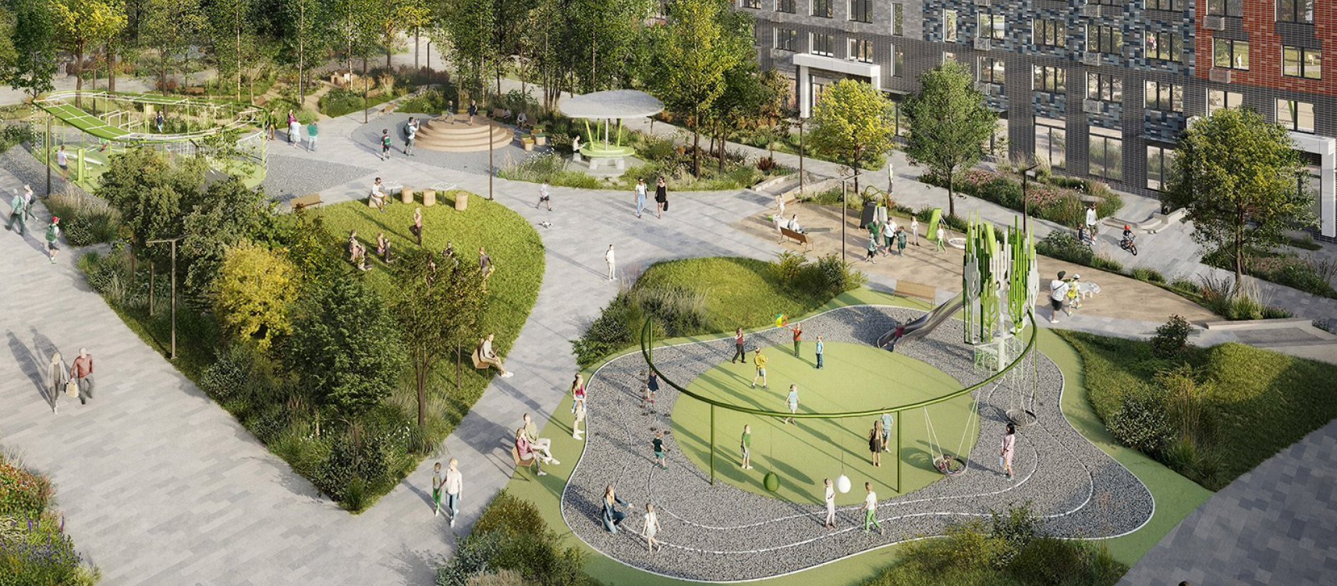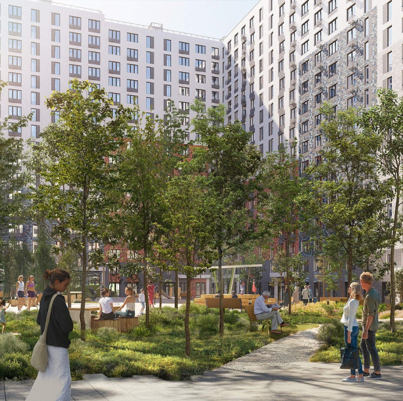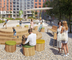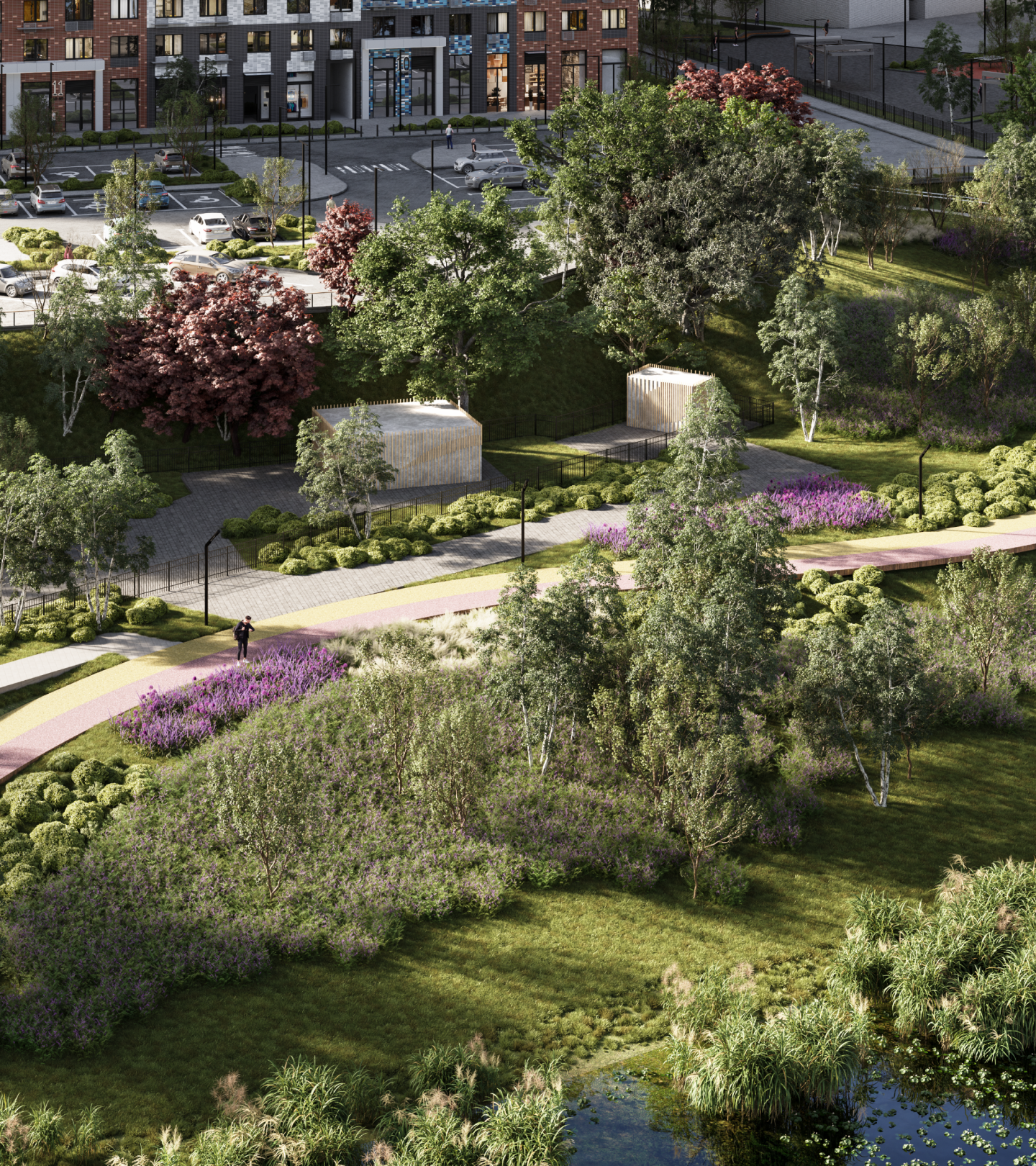 Акцент во дворе сделан на озеленение - сады, аллеи и рощи, в которых буквально растворяются площадки отдыха и активности. Важным элементом концепции является устойчивость и жизнеспособность пространства в течение длительного времени.