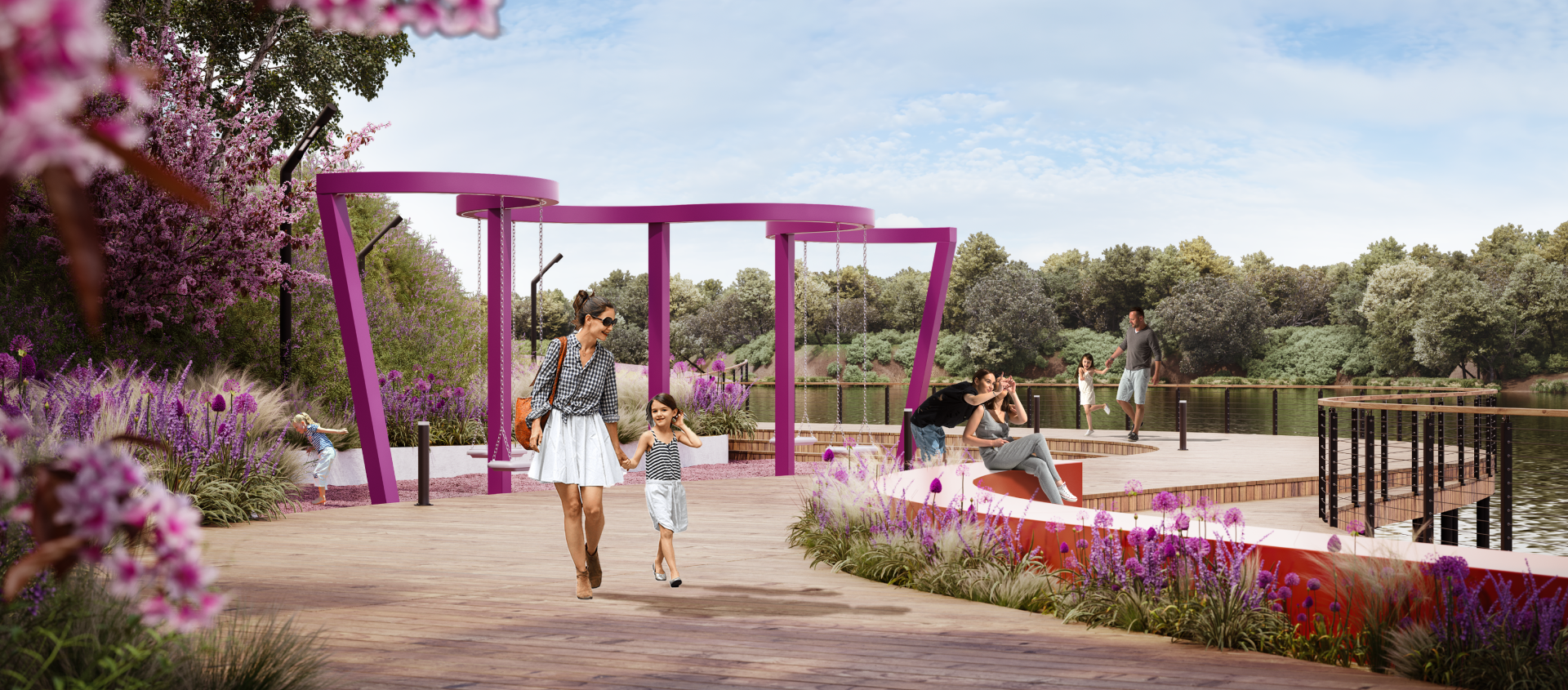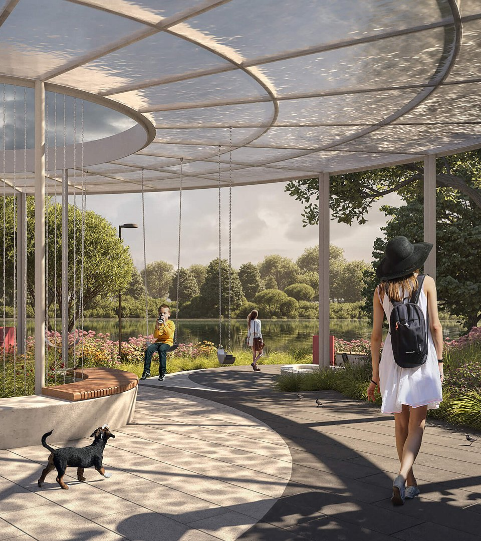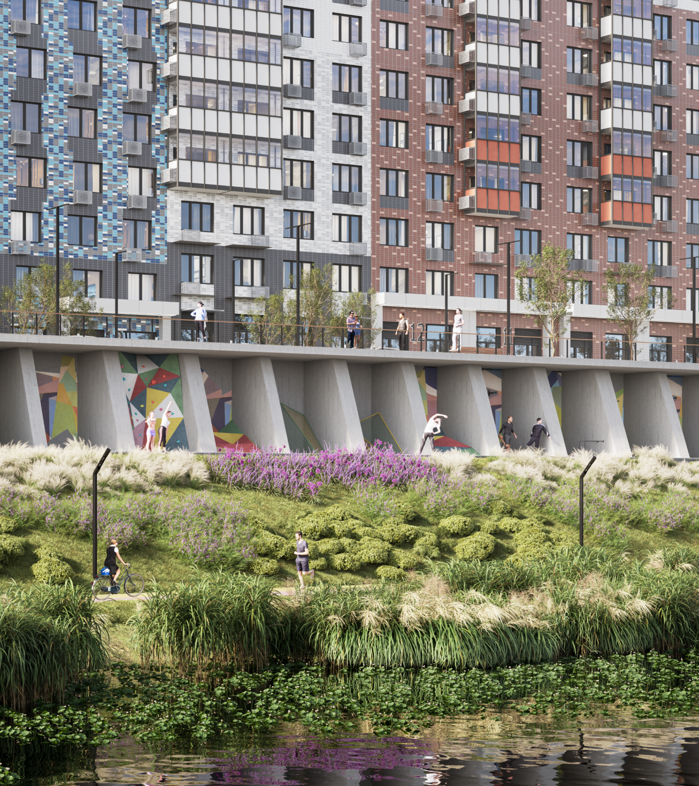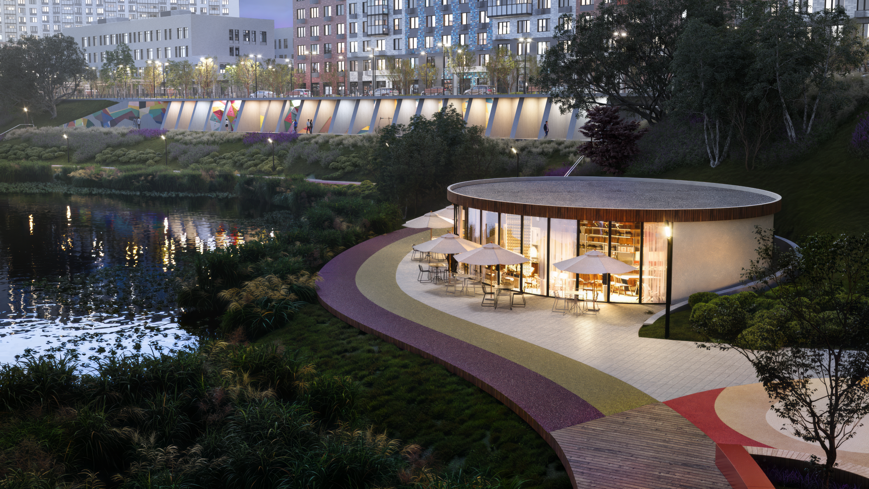 План развития территории предполагает использование цветовых акцентов и волно-образных элементов декора. Благодаря перепаду высот, на территории появится множество видовых точек с живописными видами на акваторию реки.