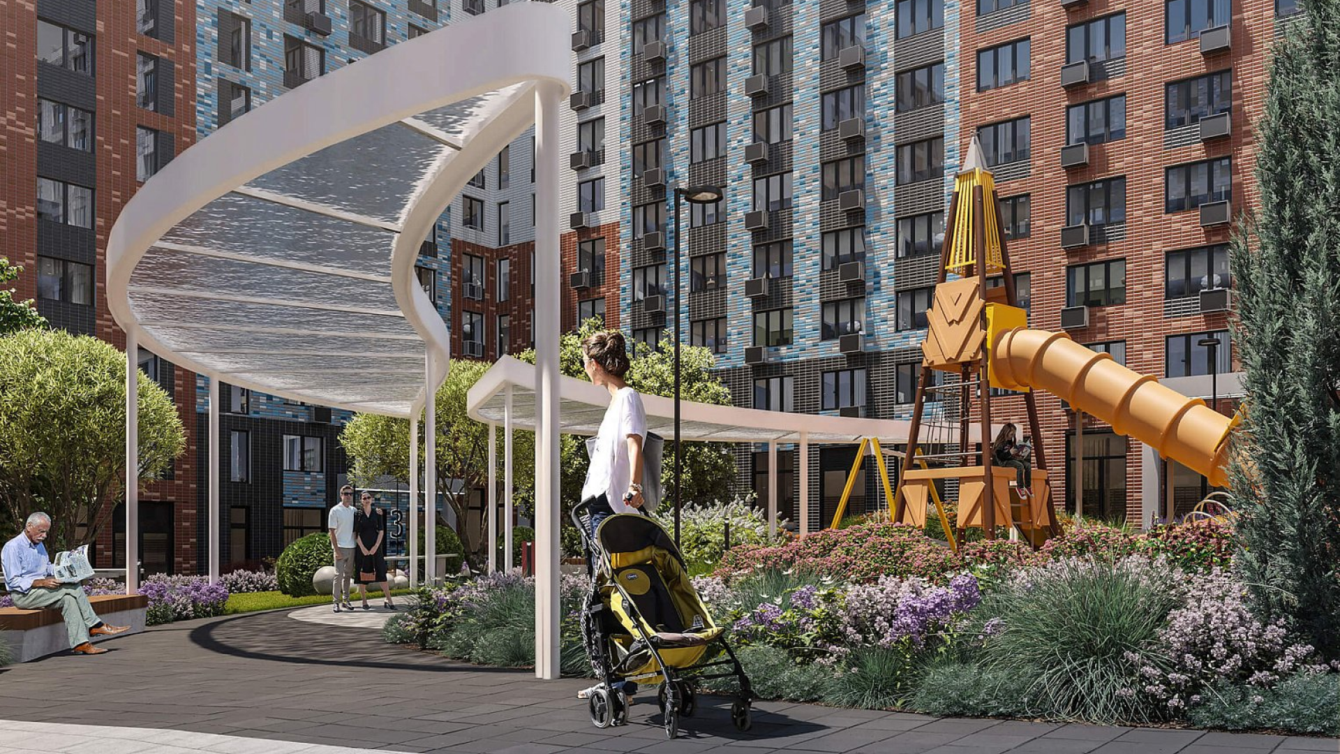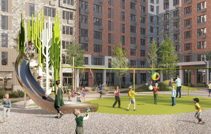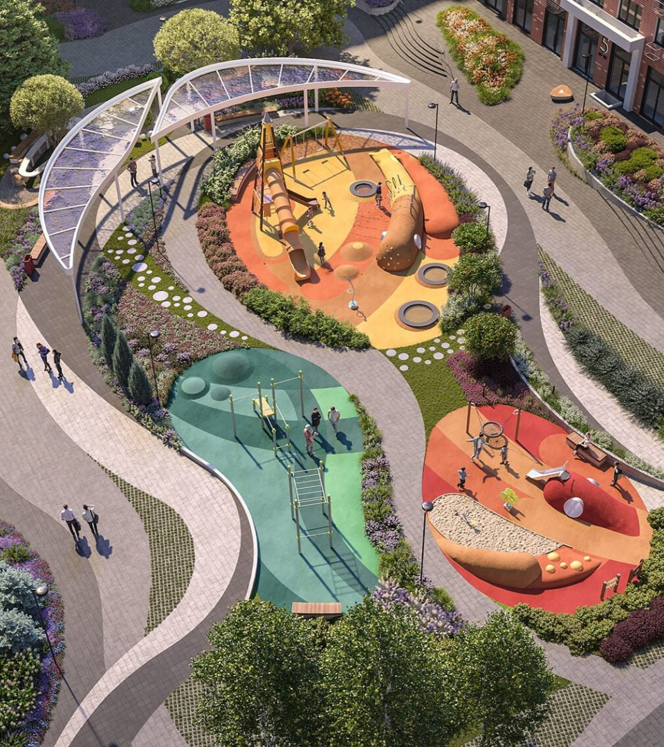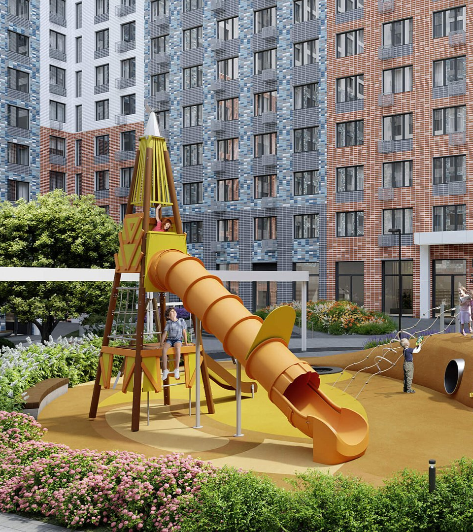 зона детской площадки, где круглый год царят радостные эмоции и насыщенные краски. Игровое оборудование подобрано по активностям и развивает фантазию и мышление ребёнка. Уровни, созданные перепадами геопластики, способствуют развитию координации ребёнка, а для самых маленьких есть увлекательные игры с песком.