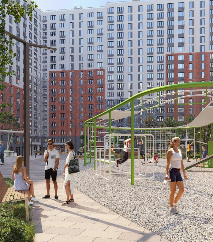 это зона спортивной активности, где вы сможете круглый год поддерживать себя в тонусе. Во дворе каждого корпуса есть свой собственный уличный спортивный комплекс.