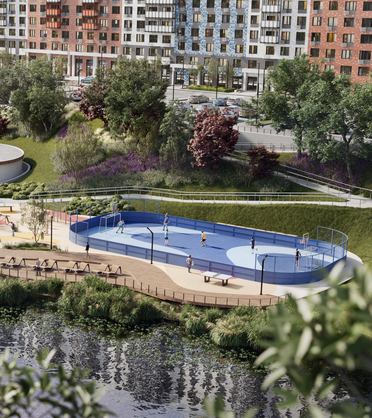 Основными точками притяжения набережной станут спортивные площадки для командных игр. Многофункциональные зоны спорта сформируют дружелюбное пространство для развития добрососедских отношений.